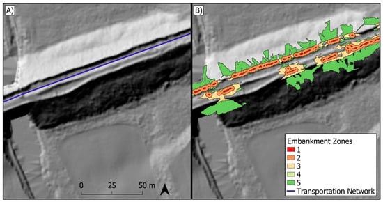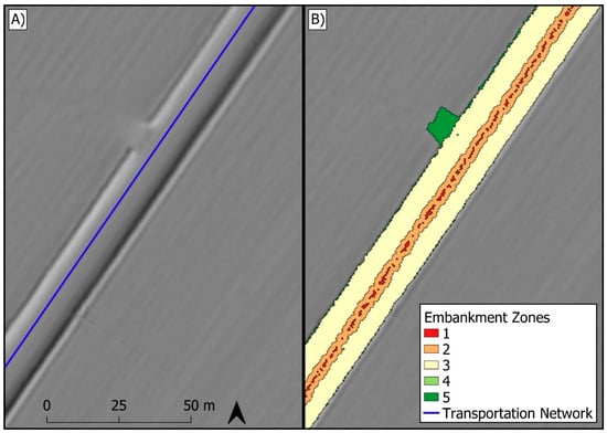 Fine-resolution digital elevation models (DEMs) such as those derived from light detection and ranging (LiDAR) are valuable for environmental modelling because these DEMs can represent topographic detail with high fidelity [1]. One consequence of this detail is the representation of surface features such as transportation embankments. In agricultural and rural areas, road and railway embankments are constructed to maintain a stable gradient across a landscape and to reduce the impact of flooding on transportation infrastructure by elevating roads and railways above the surrounding terrain [2,3]. These transportation embankments often have parallel ditches and embedded culverts to facilitate drainage off of, and away from, the embankment. This stands in contrast to roads and railways in urban settings, which are typically level with the ground surface and drained by sub-surface sewers.