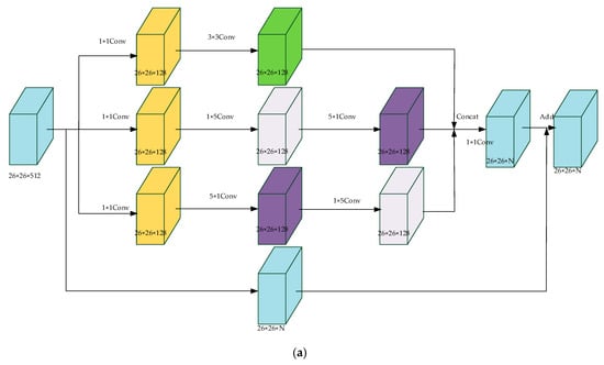 The one-stage algorithms represented by YOLO (You Only Look Once) is an end-to-end model based on CNN. Compared with Faster R-CNN, YOLO, it does not have a cockamamie region proposal stage, so it is extremely popular due to its conciseness. YOLO ((a) in Figure 1) was firstly proposed by Joseph Redmon et al. in 2015. When performing target detection, the feature extraction network divides the input image into S × S grid cells. For each grid, the network predicts B bounding boxes. Each bounding box can gain three predictive values: (1) the probability the target lies in the grid; (2) the coordinates of the bounding box and (3) the category of the target and its probability. For each grid cell, the predictive values include five parameters: ( x , y , w , h , c s ) . Among them, x , y , w , h represent the coordinate, height and width of the central point of the bounding box; c s represents the confidence score of the bounding box. The confidence of the bounding box is defined as: P ( O b j e c t ) × I O U p r e d t r u t h . If the center of the target lies in the grid, then P ( O b j e c t ) = 1 , Otherwise, P ( O b j e c t ) = 0 . The network predicts C classes. Ultimately, the tensor size of the output of the network is: S × S × ( B × 5 + C ) . The class-specific confidence can be expressed in Equation (1):