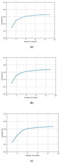 The more cluster center points we set, the larger IOU there was between the ground truth and the anchor boxes. Figure 13 exhibits the variation trend of average IOU as the cluster points increased. We can see that the curves get more and more flat. There are three detection layers in our approach and three anchor boxes were assigned to each detection lay. Table 6 shows the sizes of the anchor boxes of three datasets.
