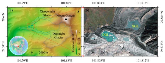 The Gongba Glacier is located on the west slope of the Mount Gongga (29°35′45″N, 101°52′45″E, 7556 m), southeastern Tibetan Plateau [,,], as shown in Figure 1a. Between the 17th and 19th centuries, the Gongba Glacier was divided into the Dagongba Glacier on the south side and the Xiaogongba Glacier on the north side []. According to the second glacial inventory data set of China [], the Dagongba Glacier has a length of 10.6 km and an area of 19.1 km2 in 2009, and those for Xiaogongba Glacier are 6.46 km and 5.73 km2, respectively. The two glaciers are the typical debris-covered type, with the moraine extended from the terminus at 3900 m elevation to the foot of icefall at 4700 m elevation [,].