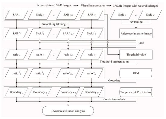 The flow chart of data processing for identifying the boundaries of glacial lakes based on proposed method.  and  denote the smoothed filtered synthetic aperture radar (SAR) image and the binarized classified ratio map, respectively.