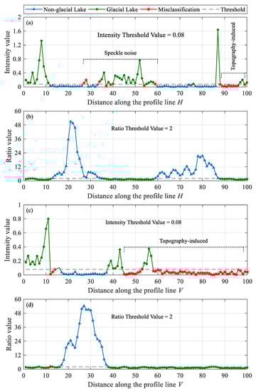 (a,c) show the distributions of intensity values along the yellow profile lines “H” and “V” in Figure 3b based on the intensity map, respectively. (b,d) show the profiles of the same lines corresponding to (a,c) in the ratio map, respectively. The green, blue, and red dotted lines represent non-glacial lakes, glacial lakes, and misclassification under the condition of using a threshold by manual.