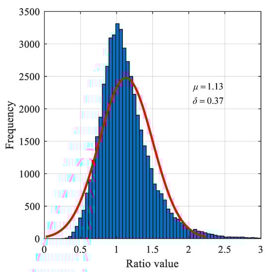 The histogram (blue bars) and the fitted normal density function curve (red line) of samples selected in the zone “T” (16 by 21 pixels) are shown in Figure 3. Note: μ and δ represent the mean and standard deviation, respectively.
