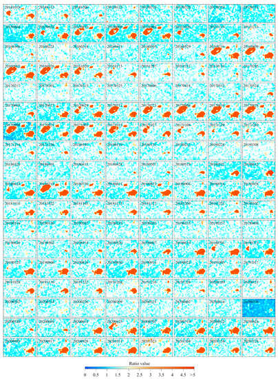The 144 ratio maps derived from the 144 Sentinel-1 A SAR images based on the proposed method. The upper left corner of each sub-figure shows the date when the corresponding SAR image was acquired, in the format of “yyyymmdd”. The color bar indicates the ratio level ranging from 0 to 5, noting that the values greater than 5 are also colored with the same exponent as 5. The region with a high ratio level represents the water surface.