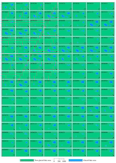 The results after the classification of glacial lakes corresponding to the 144 ratio maps shown in Figure 6, noting that the extracted boundaries are superimposed in each subgraph as the white outlines. The region colored in green represents the non-glacial lake area, while blue represents the glacial lake area. The upper left corner of each sub-figure shows the date when the corresponding SAR image was acquired, in the format of “yyyymmdd”. The lower right corner of each sub-figure is marked with its dynamic status in the cycle.  and  indicate that it is filling and discharging,  and ○ indicating it is dynamically stable and completely drained.