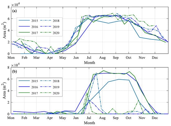 (a,b) show the annual water area changes of the XGL and DGL between 2015 and 2020, respectively. The curves corresponding to each year are superimposed for visual comparison.