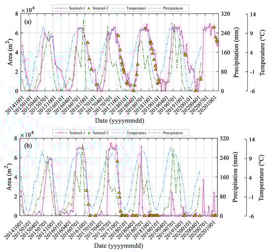(a,b) show the XGL and DGL area changes from October 2014 to November 2020, respectively. The blue and green dotted lines represent the corrected monthly average temperature and monthly cumulative precipitation changes, recorded by Jiulong Station. The pink lines and the scattered triangles represent the spatiotemporal changes of glacial lakes calculated based on the Sentinel-1 SAR images and the Sentinel-2A/B optical images.