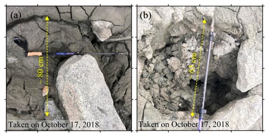 In recent years, a large number of supraglacial ponds and moraine-dammed lakes have been formed on the glacier tongue, of which the largest two are located at the terminus of Dagongba Glacier and Xiaogongba Glacier, labeled the Dagongba Glacial Lake (DGL) at 4100 m elevation and the Xiaogongba Glacial Lake (XGL) at 4130 m elevation, respectively, with a total area of more than 120,000 m2 (see Figure 1b). By the interpretation of satellite images, the water in both XGL and DGL is characterized by periodic recharging in the warm season and discharging in the cold season. According to our field survey in June and October 2018, the XGL and DGL are formed when the runoff at the glacier surface is obstructed and gathered by the terminal moraine deposits.