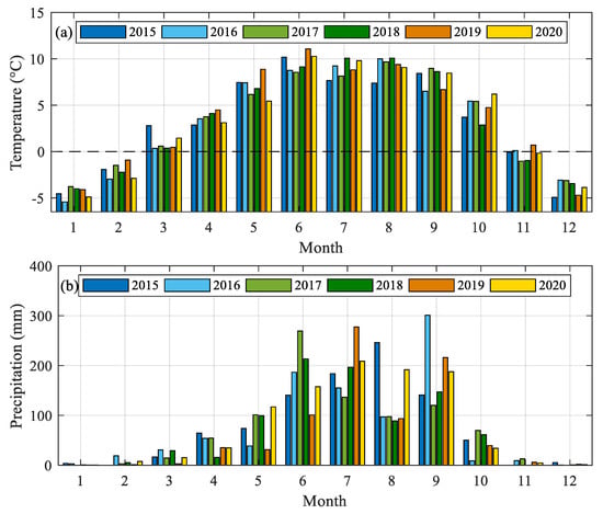 (a,b) show the comparison of monthly mean temperature and cumulative precipitation from 2015 to 2020, respectively.