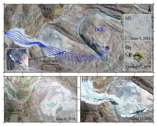 (a) The drainage path of the glacial lake outburst flood in July 2018 for the DGL, with the dashed blue lines being the conjectured subglacial channel, the solid blue lines being drawn based on flood scour traces, and the cyan dotted line showing the outline of the DGL. (b,c) are orthophotos based on images acquired by drones on June 9 and October 17, 2018, respectively, with the red dotted line showing the flood-damaged surface area. (d,e) are orthophotos of the new, large drainage entrance at the bottom of the DGL basin on 9 June and 17 October 2018, respectively, with the yellow line showing the outline of this drainage entrance. (f) shows the outlet of the DGL outburst flood.