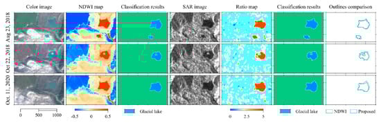 For the data used in this study, since the Sentinel-1 and Sentinel-2 satellites had different revisit intervals, only three times were available where these two satellites collected data on the same day, 23 August 2018, 22 October 2018, and 11 October 2020. We generated their color images, NDWI maps, classification results based on NDWI, SAR images, ratio maps, and classification results based on the proposed method and overlaid boundaries derived from the different methods for visual comparison, shown in Figure 13. The overlaid boundaries shown in the last column of Figure 13 indicate the consistency of the results derived from these two different methods. For an example of the images acquired from 22 October 2018 (second row of Figure 13), an isolated island was exposed in the XGL during the discharged phase and observed on both optical and SAR images with similar outlines. The area changes of XGL and DGL are superimposed in Figure 9a,b, respectively. Comparison between the areas of the glacial lake extracted by Sentinel-1 and Sentinel-2 showed remarkable similarity, and the time series of these two classified results also showed a consistent trend.