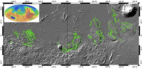 - Tanaka, K.L.; Skinner, J.A.; Dohm, J.M.; Irwin, R.P.; Kolb, E.J.; Fortezzo, C.M.; Platz, T.; Michael, G.G.; Hare, T.M. Geologic map of Mars; United States Geological Survey: Menlo Park, CA, USA, 2014. [Google Scholar]