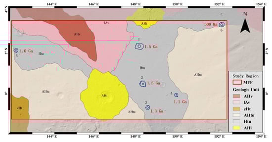 Distribution of layered ejecta craters and the absolute model age (AMA). The base map is the geological map [11] overlaid on the Mars Orbiter Laser Altimeter (MOLA) hillshade relief map. The red rectangle is about 607 m from east to west and 273 m from north to south.