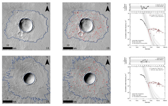 The boundaries of the layered ejecta were mapped in the Environmental Systems Research Institute’s ArcGIS platform with the extension CraterTools [50]. The inner boundaries of the layered ejecta, i.e., the rim of the corresponding crater, were also mapped. The area between the inner and outer boundary of the layered ejecta was used for age dating of the layered ejecta. The area can be determined by CraterTools independent of the map projection [50].
