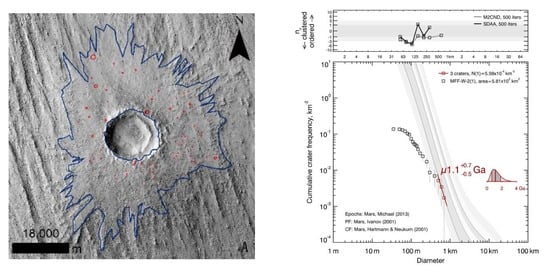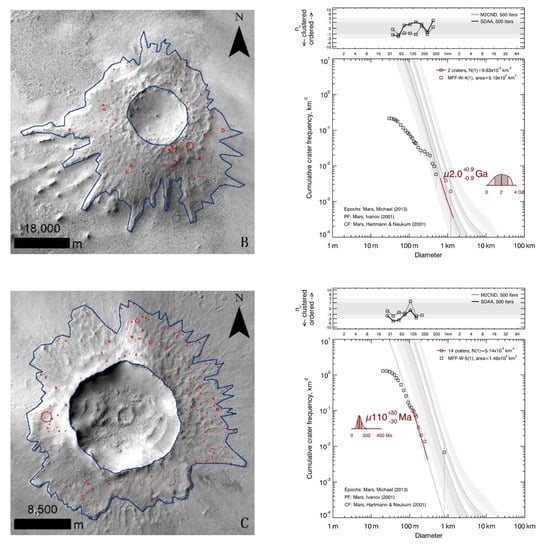 Craterstats2 software (https://www.geo.fu-berlin.de/en/geol/) (accessed on 1 January 2021) was used to derive the AMAs of the layered ejecta. This software has assembled almost all the existing chronology and production functions for Mars, and it has been widely used in Mars surface dating (e.g., [53]). In this process, the Martian chronology system of Neukum–Ivanov (2001; see [18,29,51]) and the production function by Ivanov (2001) were used. The AMAs of the layered ejecta were derived with the Poisson fitting [24], which expresses the result as a likelihood function through Poisson statistics, and Bayesian inference and the resulting uncertainty is independent of the grouping of the crater size-frequency distribution.