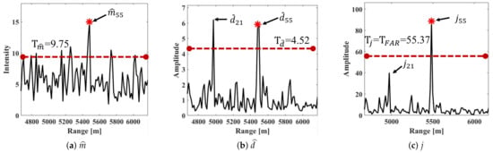 Figure 3 illustrates , , and j for the 101 range bins from the data used in Figure 2. The peaks marked as “ * ” indicate the values at the target bin, that is, the 55th bin. The red dashed lines indicate the adaptive thresholds induced by the CFAR detector with an identical false alarm rate, .