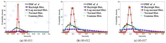 Figure 4 shows the fitting results of “00-011”, “00-012”, and “00-017”, respectively, illustrating PDFs of d (solid lines), Rayleigh (solid lines with circles), Log-normal (solid lines with diamond), Normal (dotted lines), and Gamma (dashed lines) distributions. It is shown that the Gamma distribution obviously fits to the PDF of d, compared to the other PDFs. The parameters of the distributions are estimated by MoM methods. Furthermore, Table 2 summarizes the fitting error value obtained by the chi-squared test [38]. from Gamma distribution is the smallest among the values in Table 2-new, which indicates that the Gamma distribution is best fitted with the PDF of d.