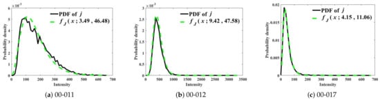 Figure 5 shows the fitting results with PDFs of j (solid lines) and (dashed lines) based on “00-011,” “00-012,” and “00-017,” respectively. Figure 5a depicts the PDF of j from “00-011” with a good fit result obtained by . The fitting result using the dataset ‘00-012’ is illustrated in Figure 5b, which shows good matching results for the PDF of j and with and . In Figure 5c, it is clearly shown that j obtained from ‘00-017’ provides the PDF with the shape of the product distribution of and . In short, it can be found that the PDF of J follows the product distribution of gamma distributions, , not only mathematically, as in (29), but also experimentally, as shown in Figure 5.