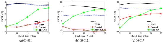 Figure 6c shows the detection result using the dataset “00-017,” indicating the best performance (i.e., the highest ASCR) of “J” among the four detection techniques. “RBF-NN” and “Fractal” have an increasing ASCR over T but are much lower than “J”. Even for the longest T in the range (i.e., T = 25 ms), “J” produces a nearly 3 dB higher ASCR than that of “RBF-NN” and 7 dB higher than “Fractal.” The plot corresponding to “EMD” is nearly unchanged, although it is nearly 3.5 dB lower than “J”.