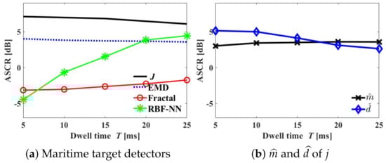 In Figure 7a, the plots for the mean value of the ASCR using all datasets above (i.e., 3000 samples) are illustrated. “EMD” produces nearly unchanged ASCRs regardless of T however, the ASCR of “EMD” is nearly 3 dB lower than that of “J” in the considered range of T. In addition, “Fractal” provides a nearly 11 dB lower ASCR than “J”, despite the slight increase as T increases. Meanwhile, it is clearly shown that the ASCR of the “RBF-NN” drastically increases as T increases. However, in the considered range of T, which is adopted for recent marine surveillance radar, “RBF-NN” a such poor performance in terms of ASCR. Contrary to these conventional detectors, it is obvious that the proposed “J” produces the highest ASCR in the considered range of T.