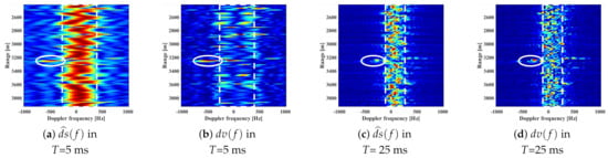 In Figure 8, the degradation in d (i.e., ) was investigated by illustrating the RD maps in different Ts, T = 5 ms and T = 25 ms. The solid ellipses indicate the highest peaks of and at the target bin, respectively. In Figure 8a,b, those in T = 5 ms are shown, respectively. With T = 5 ms, = 200 Hz is induced, as in (17). On the other hand, in Figure 8c,d, those in T = 25 ms provide much smaller = 40 Hz, which is usually regarded as an advantage in discrimination. However, the remained peaks of in T = 5 ms would offer a larger d, compared to those of T = 25 ms, especially at the target bins. Whereas, regardless of (i.e., T), the peaks of s at clutter bins are totally suppressed via (24), in ideal. Therefore, in terms of d, it results in a better performance in T = 5 ms than that in T = 25 ms.