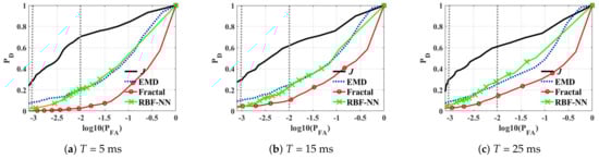 In addition, we conducted further experiments in terms of and , with plotting receiver operating characteristic (ROC) curves. Figure 8 shows the ROC curves of four different maritime target detectors in terms of on a linear scale and on a decibel scale based on the three Ts (T = 5 ms, T = 15 ms, and T = 25 ms). As shown in the three figures in Figure 8, the plots of “J” is the closest to the upper left corner. It implies that the proposed detector provides the higher compared to those of the other conventional detectors, at the range of . Therefore, it is clearly observed that “J” performs much better than the conventional ones, in the considered range of T. Furthermore, Table 3 and Table 4 summarize the results of these four detectors at and , which are the intersecting points of the dashed vertical lines and the ROC curves in Figure 9. As shown in Table 3 for , of “J” in T = 25 ms is 0.684, which is much higher than those of the conventional detectors. Even in the longer T, such as T = 15 ms and T = 25 ms, “J” provides much higher values than the others. In the case of , as in Table 4, “J” produces a much higher than the conventional detectors. Specifically, of the conventional detectors increases as T increases, as in Table 3 and Table 4 however, they have much worse detection performance in the considered range of T than “J”.