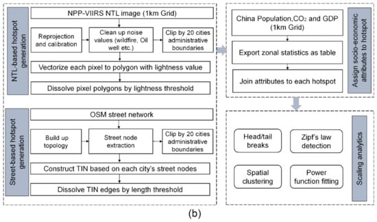 We selected 20 well-developed cities in China as study areas and primarily made use of the following three data sets: (1) VIIRS imagery, (2) OSM street network, and (3) socio-economic grid data (Figure 1a). All data sets are national coverage. The NTL data was obtained from NOAA/NCEI []. We chose one monthly image at June 2020, of which the resolution is 15-arc-s (about 500 m at the Equator). We reprojected and cleaned the image to get rid of noises (lit spots) such as burning wildfires and oil drilling, based on the method proposed by Elvidge et al. []. The national street network was downloaded from OSM, including 4,419,603 segments from which we extracted 3,172,001 street nodes based on the criterion that a node must intersect with three segments. The socio-economic grid data include the GDP and population from the National Resources and Environment Database of the Chinese Academy of Sciences [] and environmental grid data include CO2 emissions from the National Earth System Science Data Center []. Raster data sets for GDP, population, and CO2 were collected in 2010 and had a 1 km resolution. To perform the analysis, we clipped out both the vector and raster data using each of 20 city administrative boundaries, then conducted zonal statistics of cells with socio-economic attributes for each city, which were further joined with city hotspots (Figure 1b).