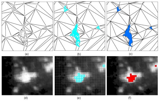 We chose two clustering approaches for each data set. For street junctions, we first computed the triangulated irregular network (TIN) to get junction–junction proximities. As Figure 2a–c shows, the area of urban hotspot can be directly obtained through the conversion of short TIN edges between points. For NTL images, the first step is to vectorize each raster pixel into a polygonal feature with the light value maintained (Figure 2e), then the hotspot can be derived through grouping the adjacent lit pixels (Figure 2f).