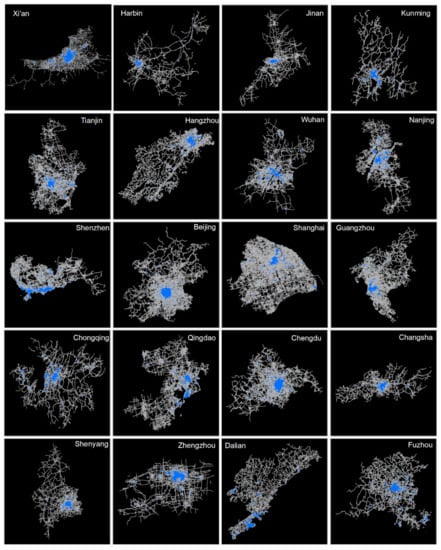 As a result of urbanization or the continuous influx of people into cities, the number of worldwide urbanites is predicted to be 6.9 billion by 2050, accounting for 68% of the world’s population []. The urbanization in China has been unprecedentedly rapid as well in the past few decades [], reaching 60.6% nationally in 2019 []. Consequently, the grasp of city form and function—that is, how cities look and work—has become the key to our sustainable development. Given the circumstances, city-related research has attracted scientists from a variety of subjects and has, inevitably, become cross-disciplinary, including geography, economics, computer science, and physics, etc. To converge these disciplines, scholars have called for a new science of cities in the past few decades, in which they view cities as an organized complexity [], for studying cities’ fractal shapes, complex structures, and nonlinear dynamics (e.g., [,,,,,,]).