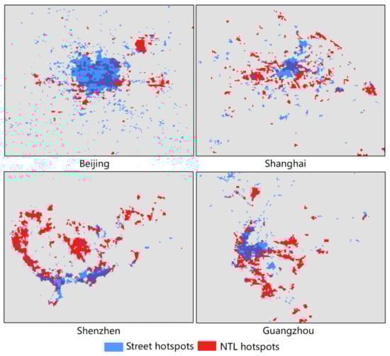 Thus, the present study attempts to investigate the intra-urban scaling properties through the lens of city hotspots. A city is formed by highly concentrated areas of human settlements or activities within a country extent []. Likewise, if we scale down our scope from a country to one of its cities, such concentrations can be regarded as urban hotspots. With the advance of geographic information system (GIS) technologies, urban hotspots can be delineated more precisely on the support of geospatial big data and bottom-up approaches. The study contributes to the current literature in three aspects. Firstly, we followed the ideas of previous city delineation methods to derive two types of urban hotspots across 20 Chinese cities: Street-based and NTL-based hotspots, from respectively the spatial clustering of individual street nodes and NTL image pixels with the cutoff determined by data’s inherent scaling properties (see details in Section 2.2). Secondly, we found that Zipf’s law held remarkably well for both street-based and NTL-based hotspot sizes per city, as do the city-size distributions on the national scale. The scaling exponents derived based on NTL-based hotspots were also consistent with the established regimes, implying that NTL-based hotspots can act as better spatial units for urban analysis. Thirdly, we found that the spatial discrepancy between the street-based and NTL-based hotspots can lead us to deep insights on urban planning and development.