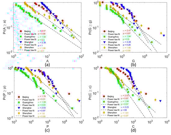We applied the robust power law detection based on the MLE method to two types of hotspots in 20 cities. For each city, we listed the power-law fitting metrics regarding its hotspot areas detected using the cutoffs derived from head/tail breaks (Table 3). We can see that Zipf’s law held remarkably well for both types of urban hotspots. As stated, the power-law exponents for street hotspots were centered at 2.010.15, while the averaged exponent value for NTL hotspots was slightly smaller, 1.921 0.19, due to the exception of Chengdu (1.46). Most of the p-values were above 0.05 and readers can cross-check the results in Table 3. In addition to the hotspot sizes, we also examined the power law fit of the socio-economic status within the hotspots in the top four cities. As Figure 6 shows, the power-law distribution still holds for GDP, population, and the amount of CO2 emissions per hotspot, respectively. However, the values of exponents for each city performed slightly differently. Specifically, the exponents of three urban metrics inside the hotspots remained relatively stable with the hotspot size in Guangzhou and Shanghai, but less so in Beijing (up-and-downs around ) and Shenzhen (all smaller than ).