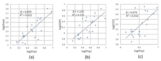 The examination of urban scaling concerns two perspectives: The power law detection of a single urban indicator (as mentioned in Section 2.2.2) and the power relationship between two types of urban quantities (for example, urban areas versus populations). The latter have been formulated as the universal scaling law [] for most of the urban indicators, which uses the power function fitting between an urban indicator and the urban population size across cities at time , denoted as Equation (6):