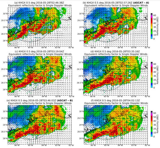 An MCS was present over Houston (TX) on 28 May 2016 that coincided with the overpasses of the MetOp satellite series and was within the range of the KHGX radar. Ground-based radars are a valuable platform to study and detect features associated with convective systems [33,56,57,58]. The evolution of the MCS is depicted in Figure 1 by the radar reflectivity and single-Doppler radar wind-field retrieved at the lowest elevation angle. The overpasses of ASCAT-A and ASCAT-B at the closest times relative to the radar are also indicated (Figure 1b,e). The reflectivity field indicated that the system was slowly moving toward the southeast with the highest reflectivity magnitude reaching 56 dBZ within the convective core. An extensive stratiform region was visible at 3:35 UTC onwards (Figure 1d–f). During the last time step (Figure 1e,f) the system started to dissipate as the reflectivity magnitude decreased within the stratiform and regions of the main convection, although regionally the highest reflectivity remained the same. This reflectivity structure within the MCS is in line with the detailed analysis of MCS in Houze [59]. A similar case of a squall line was studied in Smull and Houze [60]; however, their case was strictly over land. The authors used reflectivity radar data to show that the system propagated towards the east-southeast and system-relative Doppler horizontal velocity to identify the presence of a rear-inflow jet (RIJ), and a gust front marked by strong low-level convergence. Doppler winds at the lowest scanning elevation angle can be representative of the near surface wind-conditions depending on the distance from the radar. Figure 1 was created to identify the structure and propagation of the MCS, along with the kinematic characteristics of the flow. The range rings during the overpasses (Figure 1b,e) are spaced at 50-km distance, where the retrievals at 100 km and 150 km from the radar location are obtained at a height of 1.5 km and 2.8 km, assuming standard beam-propagation conditions. The analysis revealed the presence of a descending rear-to-front flow that was characterized by a strong northwesterly flow reaching a height of 1.5-km. The descending flow (RIJ) typically forms as a response of the latent heat released by sublimation, melting and evaporation below the trailing-stratiform cloud Houze [59]. The RIJ was present during all time steps, fueling the MCS. The increase in the wind speed over a rear-inflow jet was also observed by Keene and Schumacher [61], who used observations and simulations to understand the mechanisms responsible for the initiation and maintenance of a convective line.