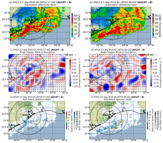 NEXRAD (KHGX) and single-Doppler analysis wind fields. The subfigures at the left correspond to the closest time of ASCAT-A overpass: (a) Radar reflectivity field (in dBZ), (c) single-Doppler analysis wind field (in m s) and divergence field (in s), and (e) radar-estimated precipitation rate (in mm h) with enhanced spectrum width magnitude (in m s). (b,d,f) have the same configuration but correspond to the closest time of ASCAT-B overpass. Dashed concentric circles indicate radial distance from the radar at 50, 100 and 150 km.