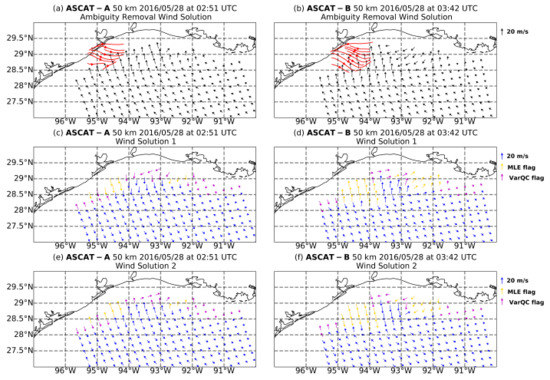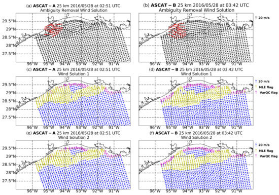 ASCAT-A and -B 50-km wind products on 28 May 2016 at 02:51 UTC and 03:42 UTC, respectively. Black vectors in (a,b) correspond to ASCAT-A, -B winds and red streamlines to radar-derived winds at the lowest elevation angle. (c,e) correspond to ASCAT-A wind solutions 1 and 2 of the available solutions. Blue vectors correspond to good quality wind retrievals, gold and magenta to retrievals for which the MLE and variational quality control flag has been activated, respectively. (d,f) have the same configuration as (c,e) but for ASCAT-B.