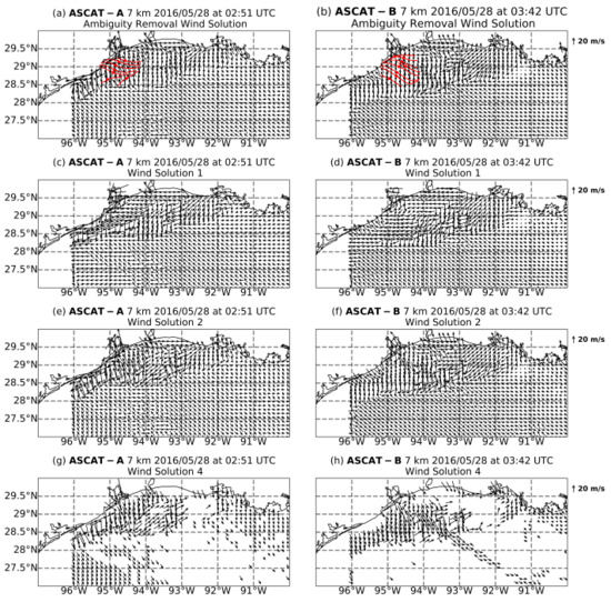 The correction method described in the methodology section was applied to rain-afflicted ASCAT wind vectors, offshore of Houston, where the ambiguity removal process most likely failed. Around and wind retrievals were flagged by the MLE for both ASCAT-A and -B (Figure 3c–f; gold vectors), indicating large distance between the ambiguous solution 1, 2 from the GMF and ECMWF background winds. Large values for the MLE might indicate that the retrieval is contaminated by rain or confused sea state. Not surprisingly, this area was severely affected by high rain rates (Figure 2e; 70 mm h), therefore the Doppler retrievals should have been more representative of the wind field than the scatterometer winds. In the absence of any other observations, the observed sounding at KLCH station at 12 UTC indicated a uniform wind flow (southwesterly) up to height of 1.5 km, therefore the correction method was applied to scatterometer wind vectors up to 100 km radial distance from the radar location. For example, the first wind solution for ASCAT-A (Figure 3c) captured north-northwest wind direction over the respective region, whereas the second wind solution (Figure 3e) indicated south-southeast wind direction, with the latter being the solution selected by the ambiguity process. The single-Doppler analysis wind field (Figure 2c) captured north-northwest wind direction over an area that expanded radially outwards from the location of the radar. For each wind vector cell that fell within the radar domain, the wind direction of the optimal solution was substituted with the Doppler-compliant unambiguous wind direction; i.e., north-northwest (Figure 3c, wind solution 1). The suggested wind solution was was then constructed for all ASCAT wind retrievals at 50-km.