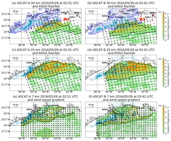 Adjusted ASCAT wind vectors (black vectors) and gradient wind magnitude are depicted for the overpasses of MetOp-A and -B. Left column, i.e., (a,c,e), corresponds to ASCAT-A overpass at 02:55 UTC on 28 May 2016; right column, i.e., (b,d,f) to ASCAT-B at 03:47 UTC. From top to bottom spatial resolution increases from 50 km to 7 km. Black polygons correspond to gradient wind features. KHGX precipitation rate (>40 mm h) is depicted in light blue filled contours and reported at 02:57:26 UTC for ASCAT-A and 03:46:03 UTC for ASCAT-B. In (a,b) blue line depicts the 1 mm h rain rate border along the precipitation region and blue doted line the 6 mm h. Buoy stations and the corresponding wind (red) vectors are shown in (a).