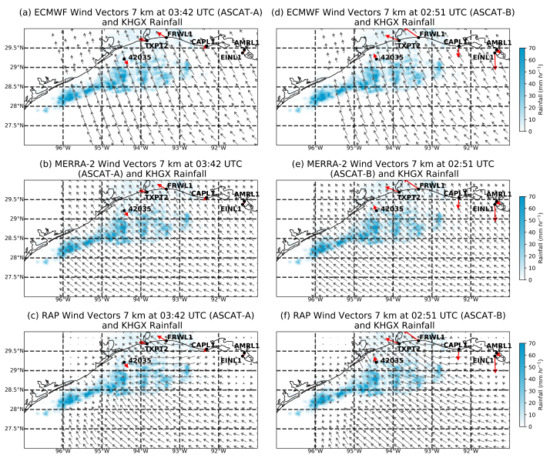 Background wind vectors are depicted in black for (a) ECMWF, (b) MERRA-2 and (c) RAP model at 02:51 UTC (ASCAT-A) on 28 May 2016; similarly for (d,e,f) but at 03:42 UTC (ASCAT-B). KHGX rainfall rate is depicted in light blue filled contours and reported at 02:57 UTC for ASCAT-A and 03:46 UTC for ASCAT-B. Buoy measurements at different stations are depicted in red vectors.