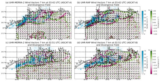 UHR wind vectors are depicted in black and divergence field in green and dark pink for (a) MERRA-2 and (b) RAP background winds at 02:51 UTC (ASCAT-A) on 28 May 2016. Similarly, (c) MERRA-2 and (d) RAP background winds at 03:42 UTC (ASCAT-B). KHGX rainfall rate is depicted in light blue filled contours and reported at 02:57 UTC for ASCAT-A and 03:46 UTC for ASCAT-B.