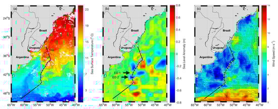 Mean maps: (a) sea surface temperature (SST), (b) sea level anomaly (SLA) and (c) surface wind of the Brazil–Malvinas Current (BMC), respectively, representing these variables’ mean fields during the INTERCONF-32 campaign. The black line represents the ship’s track. White dots represent the coincident radiosonde and XBT/CTD launching positions. SST is an 8-day mean of MODIS image between 16–23 October 2013; SLA is a daily composite of 17 October 2013 and wind is an ASCAT 3-day mean between 16–18 October 2013. Warm core eddy (ED1) and cold core eddy (ED2) locations are indicated by the black arrows.