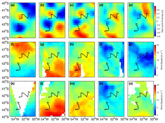 SLA (a–e), ASCAT (f–i) and WindSat (k–o) wind magnitude maps of the BMC throughout ED1 and ED2 life spans. Columns from left to right indicate consecutive dates in 1 October, 11 October, 21 October, 31 October and 10 November 2013, respectively. ED1 and ED2 translational trajectories (Figure 3) are also represented here.