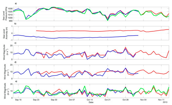 The time series of SLP (Figure 9a) registered along the ship’s route indicate that a high-pressure system was dominant over the time both ED1 and ED2 were observed, decaying from about 1000–1010 hPa to about 980 hPa at the end of the series. Figure 9a also shows that the lowest values of the wind magnitude (U10) occurred during the time when and just after the ship was sampling the cold core of ED2.