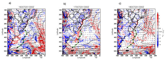 ERA5 weather maps at 00Z during days 16 (a), 17 (b) and 18 (c) October 2013. Black lines represent the atmospheric pressure (hPa), the black arrows represent the surface wind vectors (m s−1) and the color scale from red to blues represent the thermal advection from warm to cold (°C day−1). The black dots represent the ship’s position in the study area at 00Z every day during the entire INTERCONF-32 campaign (14–20 October 2013) along the ship’s track (green line).