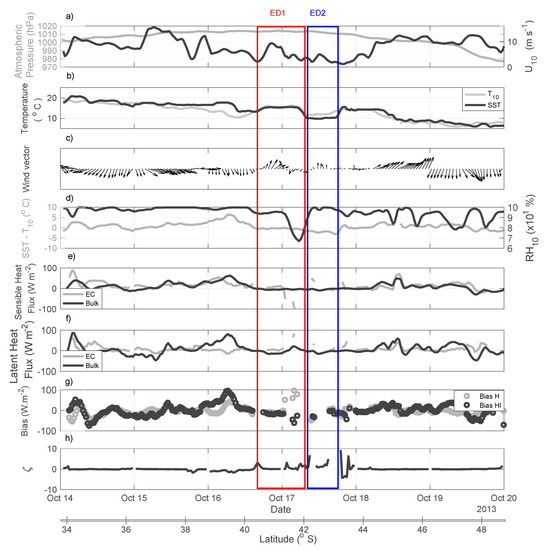Figure 9d shows a relatively steady difference in SST-Tair (±2 °C) throughout the entire series. At the ED1 and ED2 locations, the difference is close to zero. Relative humidity, however, presented a minimum of about 65% rapidly changing to a maximum (100%) in the boundary between ED1 and ED2. Although not obvious in the Hbulk time series, the rapid RH10 change between the warm and cold core eddies was mirrored by the HEC (Figure 9e). During most of time series, the sensible and latent heat fluxes ranged between ± 20 W m−2 (Figure 9e,f). Extreme peaks reached between 80–100 W m−2. Biases between EC and bulk for both sensible and latent heat fluxes (Figure 9g), in agreement to other recent findings in the BMC region [16], tended to be high when episodes such these occur: (i) rapid changes in the wind magnitude; (ii) rapid changes of the SST-Tair difference; (iii) rapid changes in the RH10 and (iv) rapid changes in the SST pattern caused by the presence of mesoscale structures.