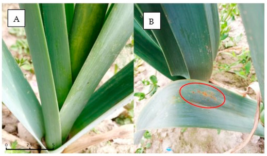 (A) Healthy leek crop with 0% leaf area infected. (B) leek plant infected with rust disease, showing orange pustules on approximately 3% of leaf area infected. Scale in cm.