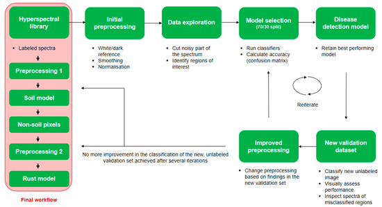 - Training label manipulation by changing labels in the hyperspectral library of problematic spectra, intentionally feeding ‘falsely’ labelled data to the model to increase model performance (see Section 2.6, Final Disease Detection Workflow) [49]