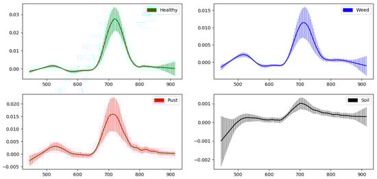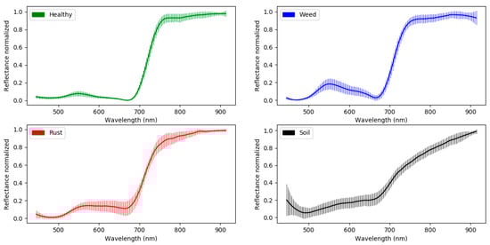Figure 6 shows a plot of the average reflectance spectrum for each of the four classes in the training dataset after normalisation and smoothing. Error bars represent the standard deviation for each wavelength. It can be observed that the healthy leek spectra appeared most ‘stable’, showing lower standard deviation values throughout the spectrum. Note that the minimum was around the 680 nm wavelength, which represents the photosystem II absorption band, which typically shows low reflectance (i.e. high absorbance) in healthy crops [51]. Weed spectra generally showed higher standard deviations, with also low reflection around the 680 nm band but with a larger standard deviation compared to the healthy leek spectra. It is interesting to note the apparent decrease in reflection at wavelengths higher than 880 nm in the weed spectrum. The difference is relatively small however, with a quite high standard deviation in this region. The rust spectrum showed both a high reflectance and a high standard deviation around the 680 nm waveband. Higher reflection in the entire red colour region of the spectrum was clearly visible, even though standard deviation values were high. It is worth noting that the red edge region appeared to start around 680–690 nm. This work therefore adopts the spectral range nomenclature proposed by Malacara (2003), but makes the distinction that the red region is defined from 625 to 690 nm and the red edge region from 690 to 750 nm [52]. The soil reflectance curve appeared more flattened compared to that of the leek, rust, and weed spectra, with less of a steep curve in the red edge region of the spectrum. The 480 nm absorption band (associated with carotenoids in leaves and soil) and the 670 nm chlorophyll absorption band showed clear minima in both the weed and healthy reflectance curves, which is in line with observation by other scientists [53]. The rust and soil reflectance curves showed no minimum at the chlorophyll band, only at the 480 nm band.