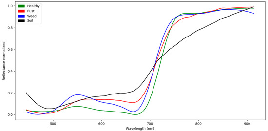 To compare the shape of the spectra of each of the four classes, the average reflectance curves from Figure 6 were plotted in one figure (Figure 7). The first important region to examine is the red edge region. The healthy leek spectrum showed relatively low reflectance in the visible region compared to the NIR region, resulting in a large ‘jump’ from the visible to the NIR part of the spectrum. This difference was less pronounced in the spectrum of the weed class, and even less in that of the rust class. The soil class showed an almost continuous incline, which is typical of soil, with only a mild rise in reflectance near the red edge [54]. Comparing the rest of the spectrum, there was little difference after preprocessing in the NIR region between all non-soil classes. The visible region seemed most likely to result in good classification performance, especially the spectral range between 450 and 680 nm, based on visible differences.
