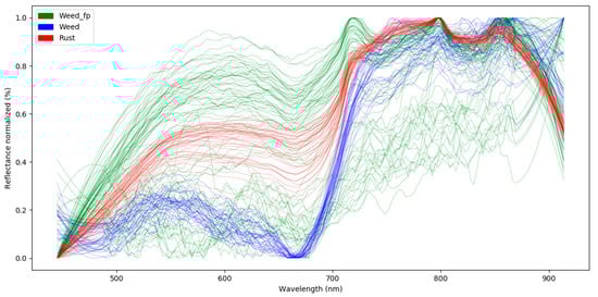 Results of the unlabelled classification still showed some misclassification of weeds in certain situations, even after the training label manipulation step described in the Materials and Methods section. Figure 9 shows a selection of these misclassified (false positive) weed spectra in green, together with rust spectra of confirmed rust pixels (red) and spectra of correctly classified weed spectra (blue). Both the green and blue spectra were selected from the leaves of one grassy weed plant, with one leaf that was classified correctly and one that was classified as a false positive. It is clear that some weed spectra (green) deviated strongly from the normal weed spectrum (blue), causing misclassification.