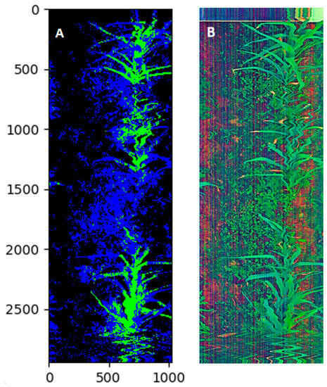 Figure 11 shows a representative scan for the Bottelare dataset, measured 43 days after the initial infection. It is representative of the Bottelare measurements because it shows no disease scores above zero (contrary to the PCG), with high weed coverage and a different soil type. It also represents a scan taken much later in the season, on 30 April 2019, thus for different weather conditions and a different growing stage compared to the images used in model building. Figure 11A shows the classified image. Figure 11B shows an RGB image taken from the hyperspectral datacube, which has been slightly enhanced using Microsoft Office Powerpoint software (Microsoft, Redmond, WA, USA) to make it clearer. There was no rust disease visibly present in the field. However, during classification of this dataset, a large number of false positives was encountered during the initial preprocessing and model selection steps. As seen in Figure 11, the final classification workflow was able to fully avoid false positives. Note that certain areas of the leek leaf are miscoloured blue, which is the result of the rust classification model being focused on accurately detecting leek rust disease, rather than accuracy concerning weeds versus healthy leek.